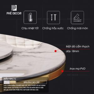 Điểm nhấn đắt giá và khác biệt nhất của bàn ăn tròn thông minh Positano BAC72 chính là mặt bàn được chế tác từ đá cẩm thạch tự nhiên, một vật liệu cao cấp mang trong mình vẻ đẹp độc bản của tạo hóa.