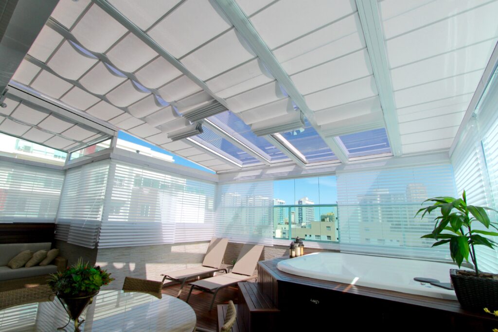 Rèm trần xếp ly có thiết kế gọn gàng, hiện đại nên phù hợp với hầu hết các không gian, từ giếng trời nhà phố, mái kính văn phòng đến các căn hộ penthouse.