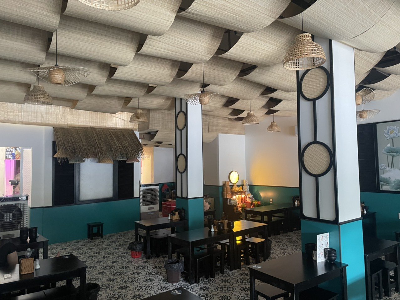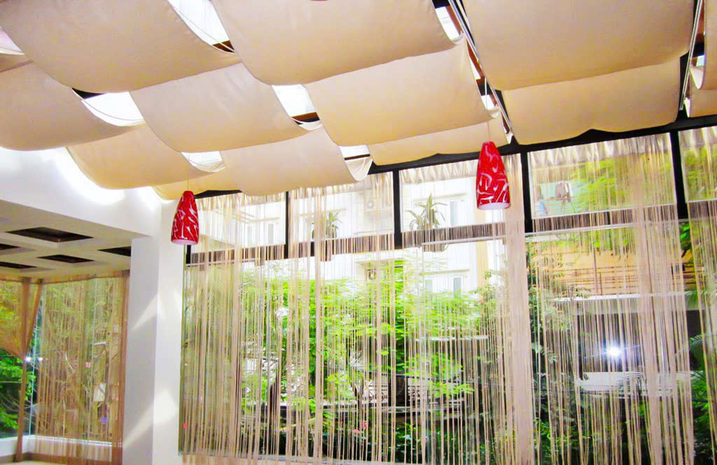 - Quán café, nhà hàng: Rèm vải thả trần dạng sóng hoặc mành tre ốp trần được sử dụng để tạo không gian lãng mạn, ấm cúng hoặc gần gũi với thiên nhiên.