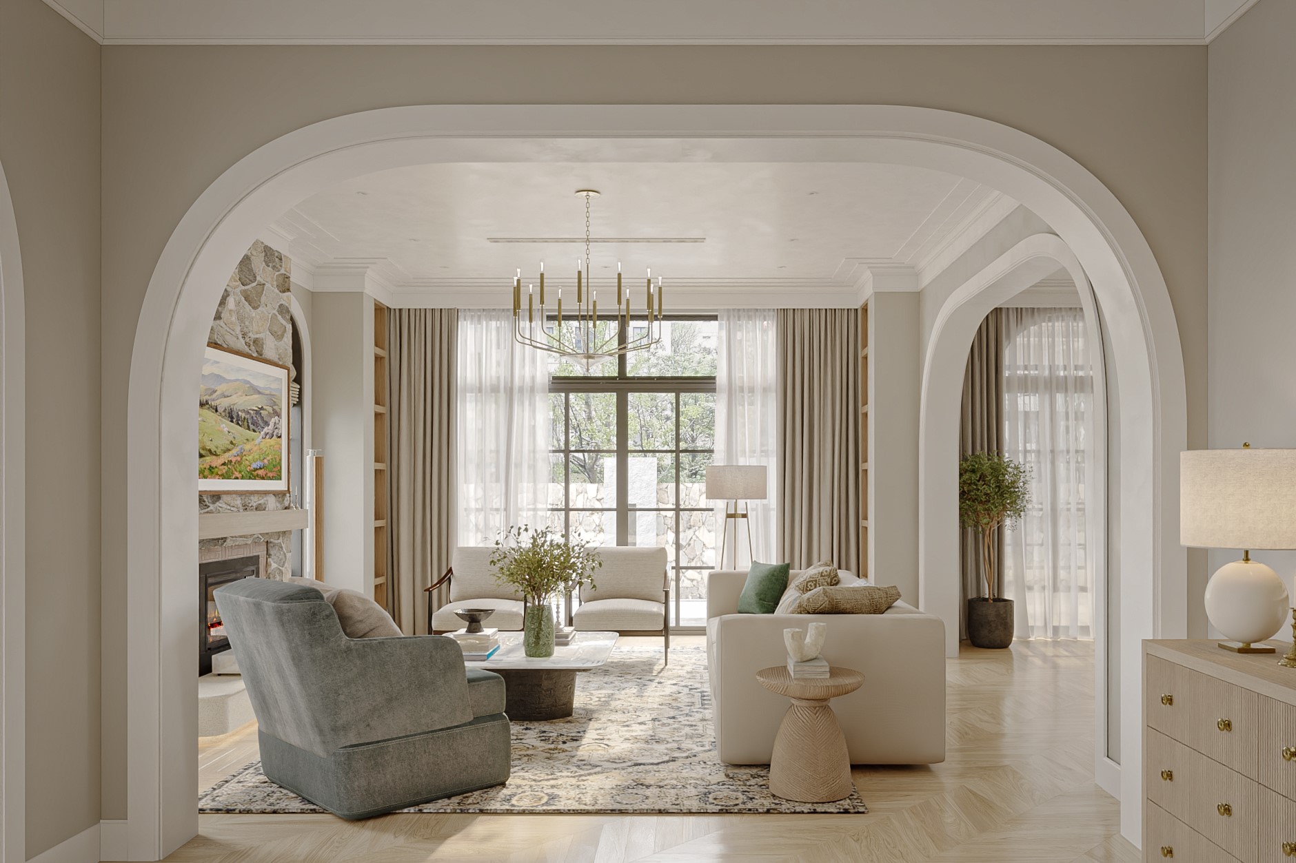 - Rèm thông tầng có vai trò gì trong biệt thự farmhouse? Rèm thông tầng giúp tôn lên vẻ bề thế của phòng khách trần cao, điều tiết ánh sáng dịu nhẹ và tạo ra những đường nét mềm mại cân bằng với vật liệu gỗ đá thô cứng.