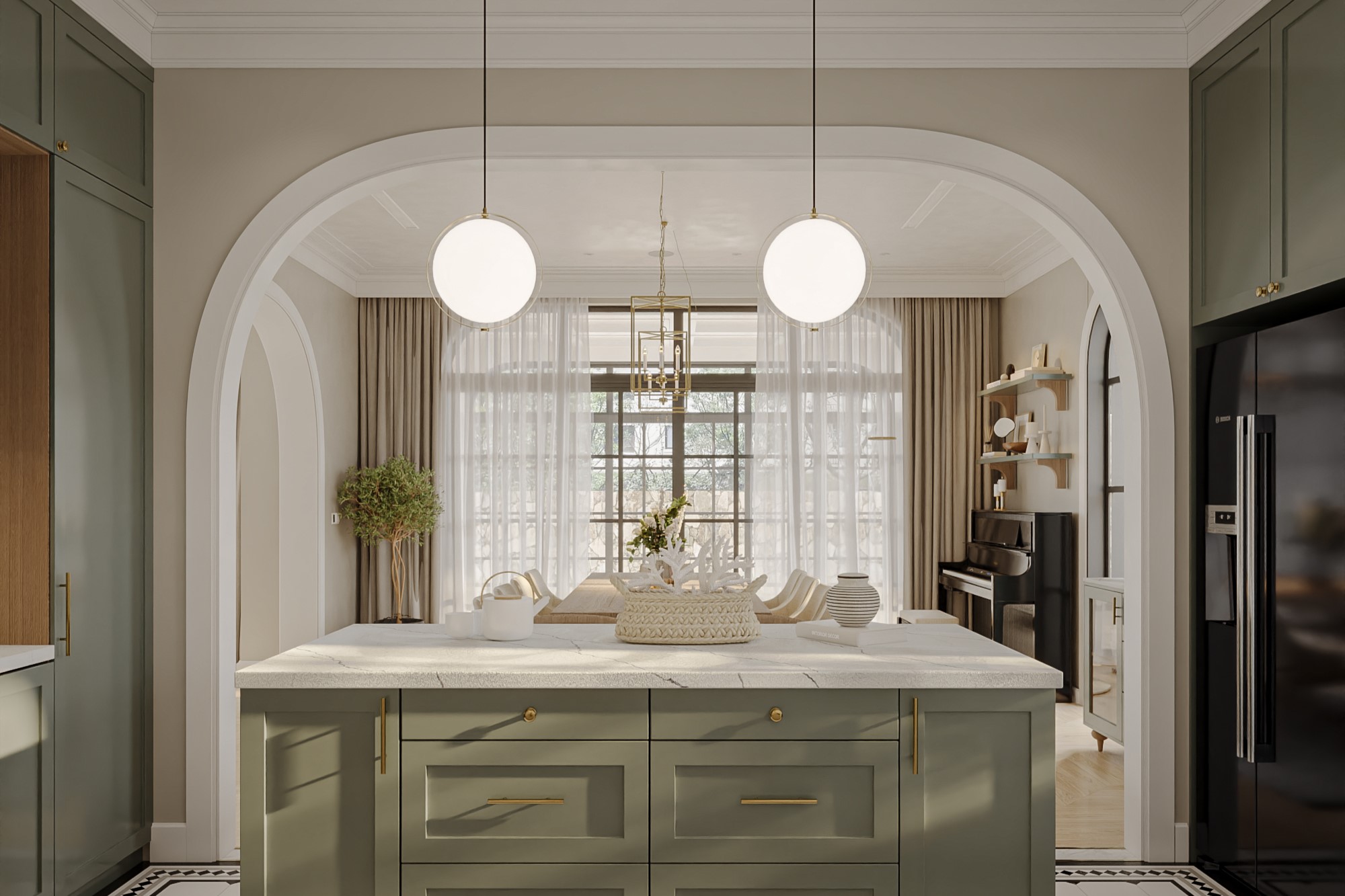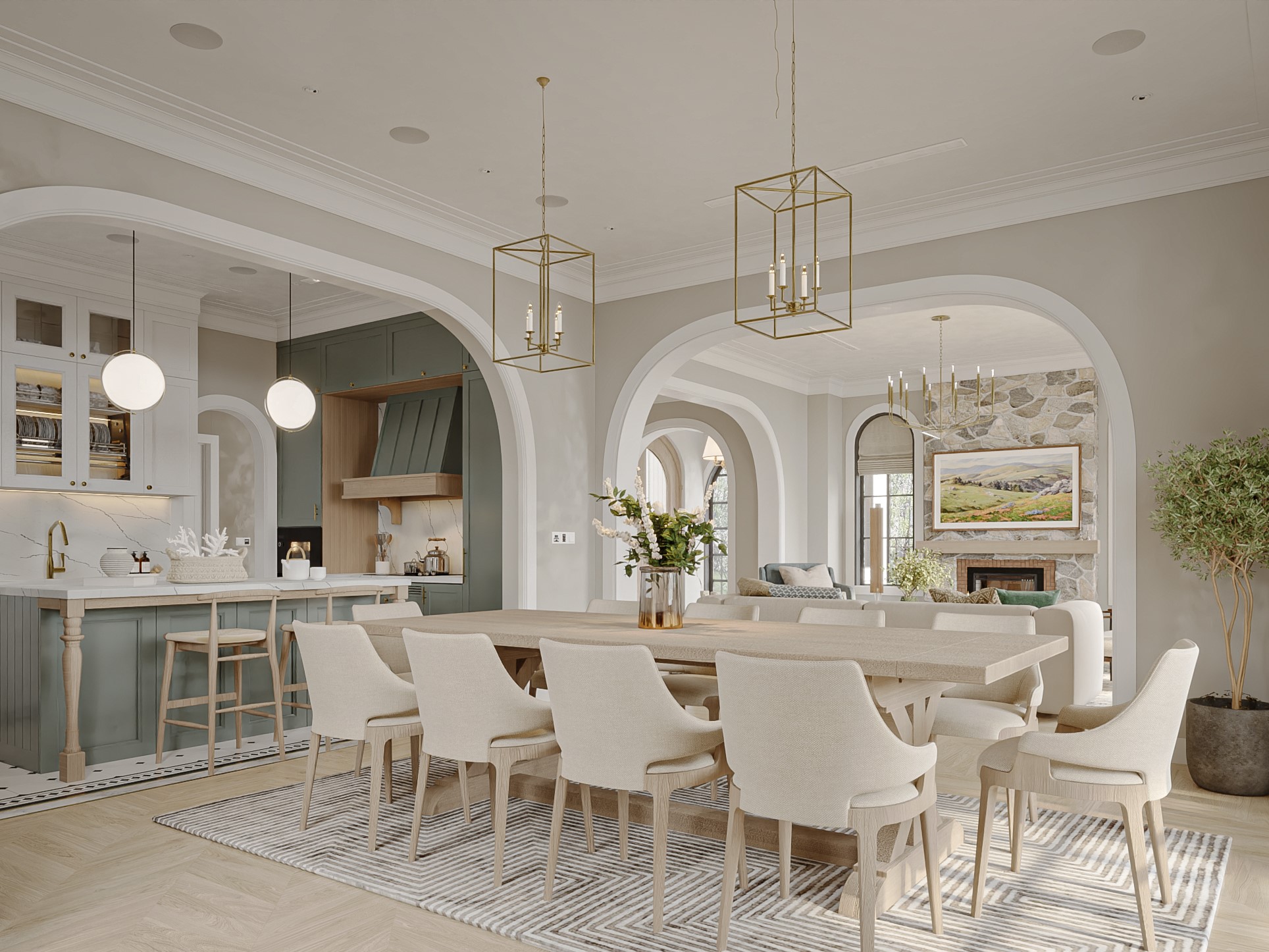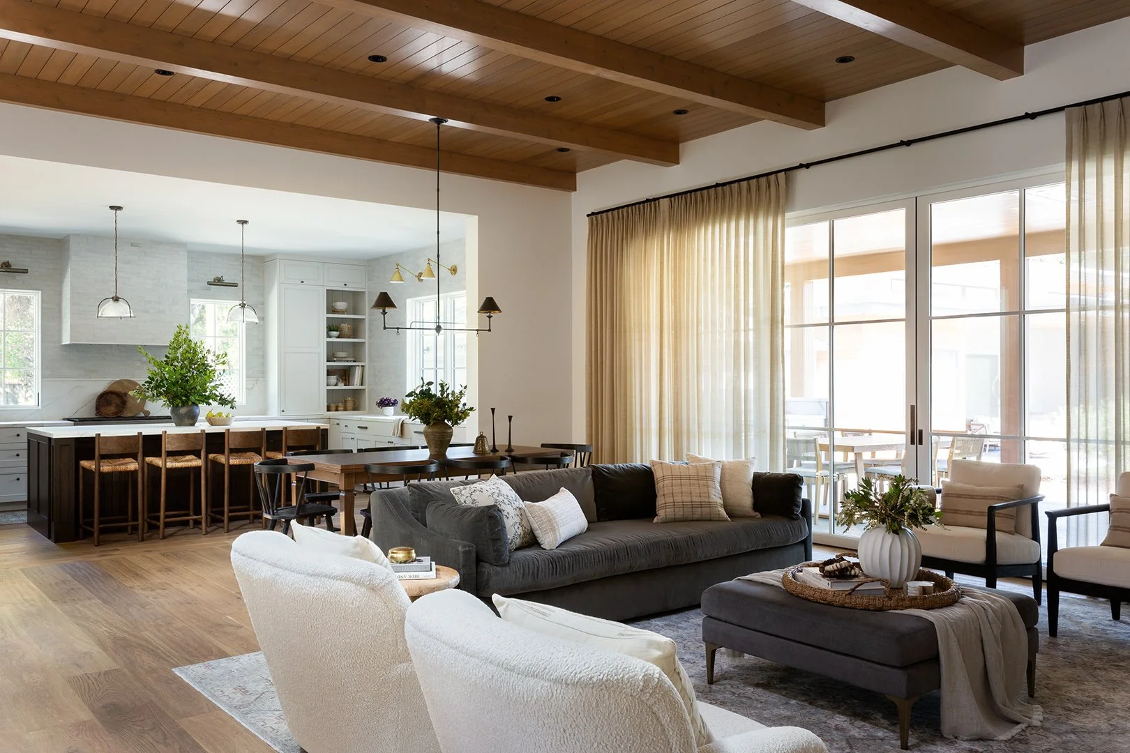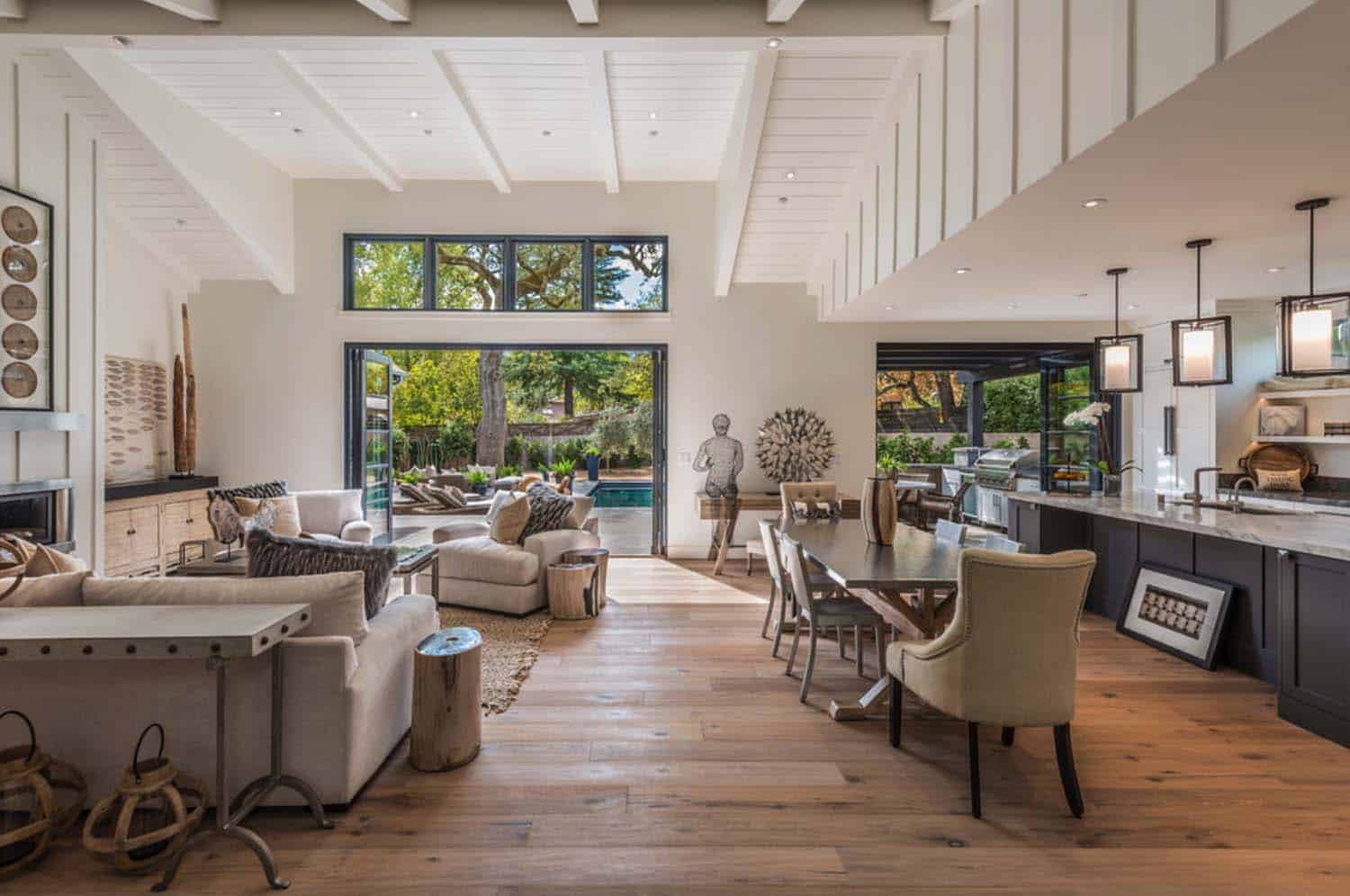 Thiết kế biệt thự liền kề theo phong cách farmhouse hiện đại tập trung vào việc xử lý không gian thông minh để tạo cảm giác rộng rãi hơn diện tích thực tế. Bằng cách sử dụng các bảng màu sáng như trắng kem, be phối cùng nội thất gỗ sáng màu, không gian liền kề vốn có nhược điểm về ánh sáng sẽ trở nên rạng rỡ và tràn đầy sức sống. Các kiến trúc sư thường ưu tiên lối thiết kế mở (open-concept) giữa phòng khách và khu vực bếp ăn để phá bỏ các rào cản ngăn cách.