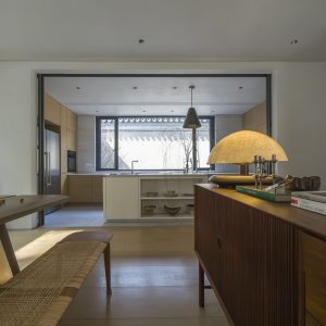 Phòng khách được bài trí tối giản với một bộ sofa lớn màu tối, tương phản với sàn gỗ sáng màu và những bức tường trắng kem. Điểm nhấn là các món đồ nội thất và trang trí mang tính điêu khắc, như bàn trà gỗ nguyên khối hay các bình gốm mộc mạc. Khu vực ăn uống nổi bật với bộ bàn ăn có thiết kế độc đáo, mang đậm tính nghệ thuật. Bếp được bố trí gọn gàng với hệ tủ gỗ sáng màu và đảo bếp tiện nghi, ngăn cách không gian một cách ước lệ mà không làm mất đi sự thông thoáng.