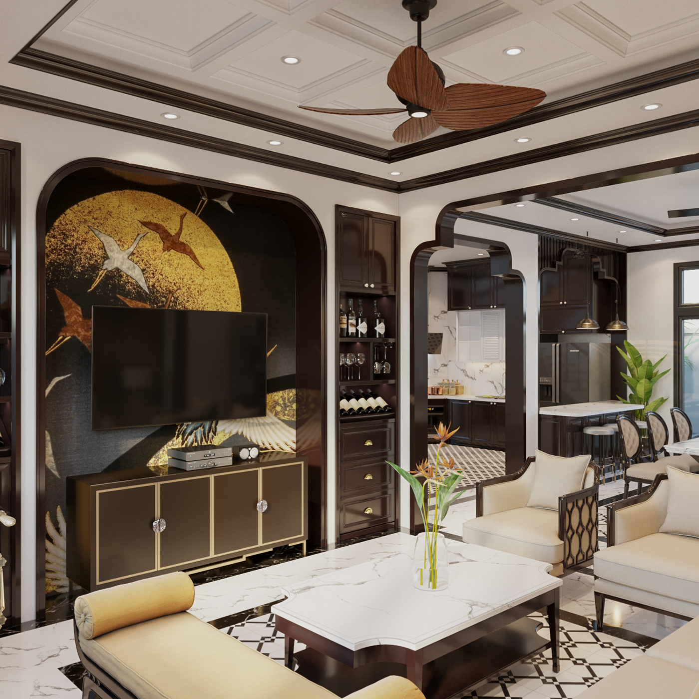 - Đặc điểm nổi bật: Sử dụng các vật liệu tự nhiên như gỗ, mây, tre, gạch bông. Màu sắc chủ đạo là các gam màu trung tính ấm áp như vàng, trắng kem. Các chi tiết trang trí như quạt trần, bình phong, tranh sơn mài là không thể thiếu.