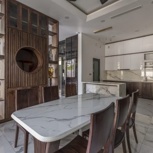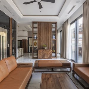 Vẻ đẹp của công trình được định hình bởi nghệ thuật cân bằng vật liệu và ánh sáng. Không gian tầng trệt trầm ấm, sang trọng với gỗ óc chó tự nhiên, được cân bằng bởi màu sơn tường và đá vân mây sáng màu. Trong khi đó, các phòng ngủ trên lầu lại mang một sắc thái trẻ trung, tươi mới với những gam màu trung tính, tạo nên một tổng thể hài hòa, đáp ứng trọn vẹn mọi nhu cầu và cảm xúc.