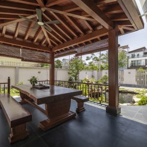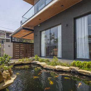 - Sân vườn và hồ cá: Một phần lớn diện tích đất được dành cho sân vườn, hồ cá, chòi thư giãn và khu vực để ông bà trồng rau sạch, nuôi gà… biến ngôi nhà thành một trang trại thu nhỏ bình yên giữa lòng đô thị.