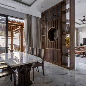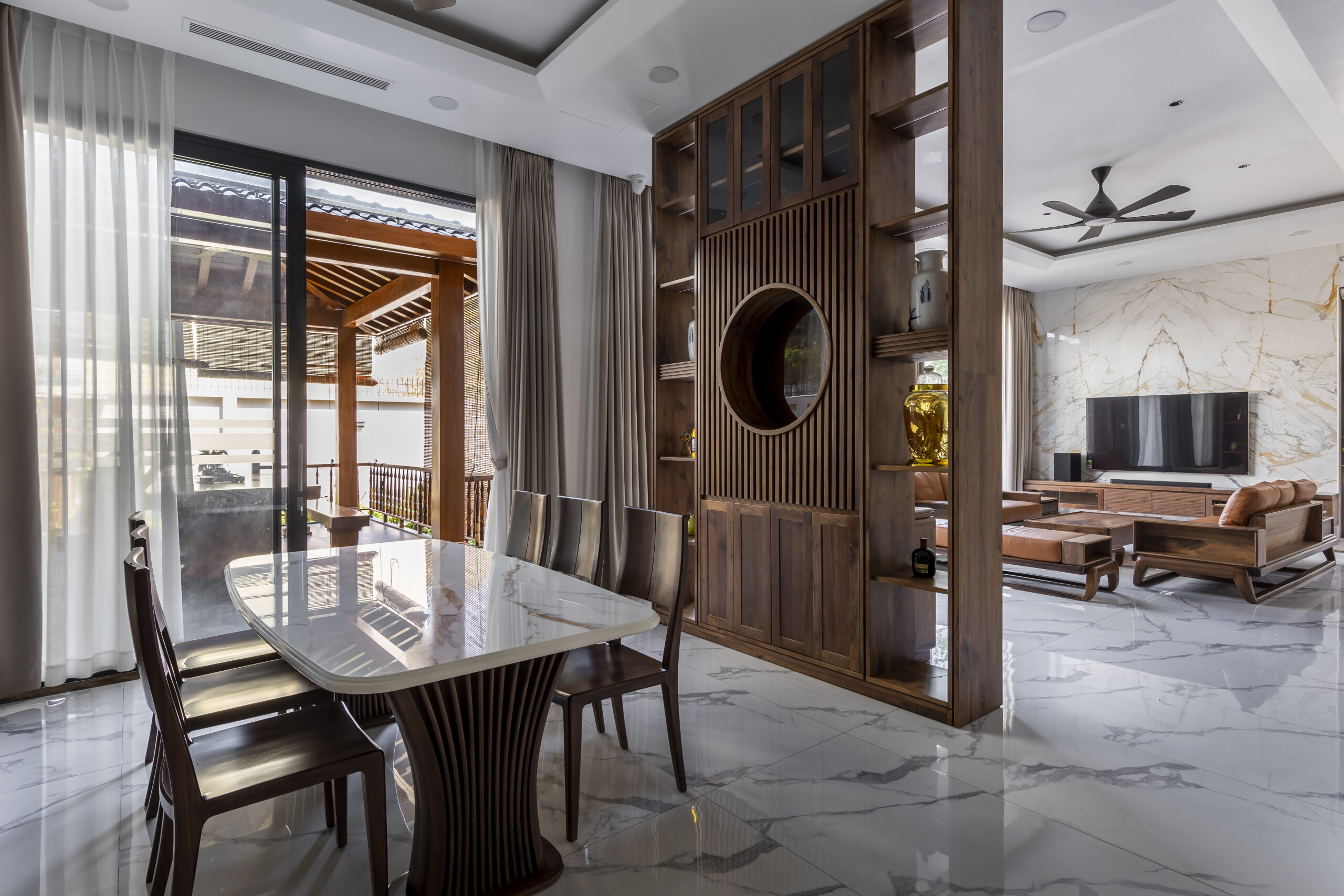 Từ phòng khách, gia chủ có thể phóng tầm mắt ra sân vườn và hồ cá trong xanh, một khung cảnh bình yên giúp xua tan mọi mệt mỏi. Phòng khách và phòng ăn được ngăn cách tinh tế bằng một vách ngăn nghệ thuật, vừa tạo sự riêng tư cần thiết, vừa không phá vỡ tính kết nối của không gian.