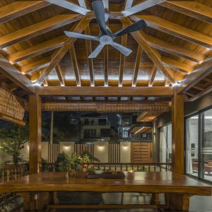 Giải pháp tối ưu là sử dụng giếng trời và các ô thông tầng. Chúng tạo ra một luồng khí lưu thông tự nhiên theo chiều đứng, hút khí nóng lên trên và đẩy không khí mát từ sân vườn vào nhà, giúp ngôi nhà luôn thông thoáng.