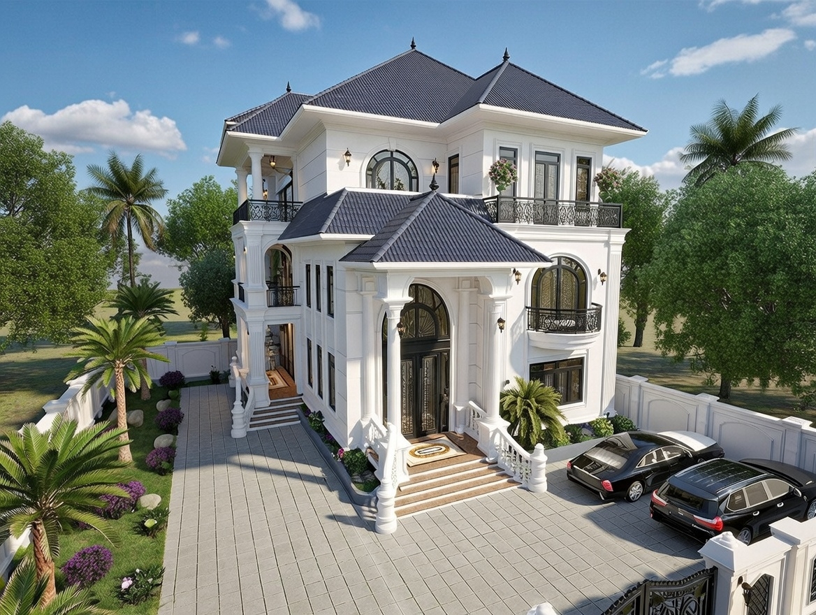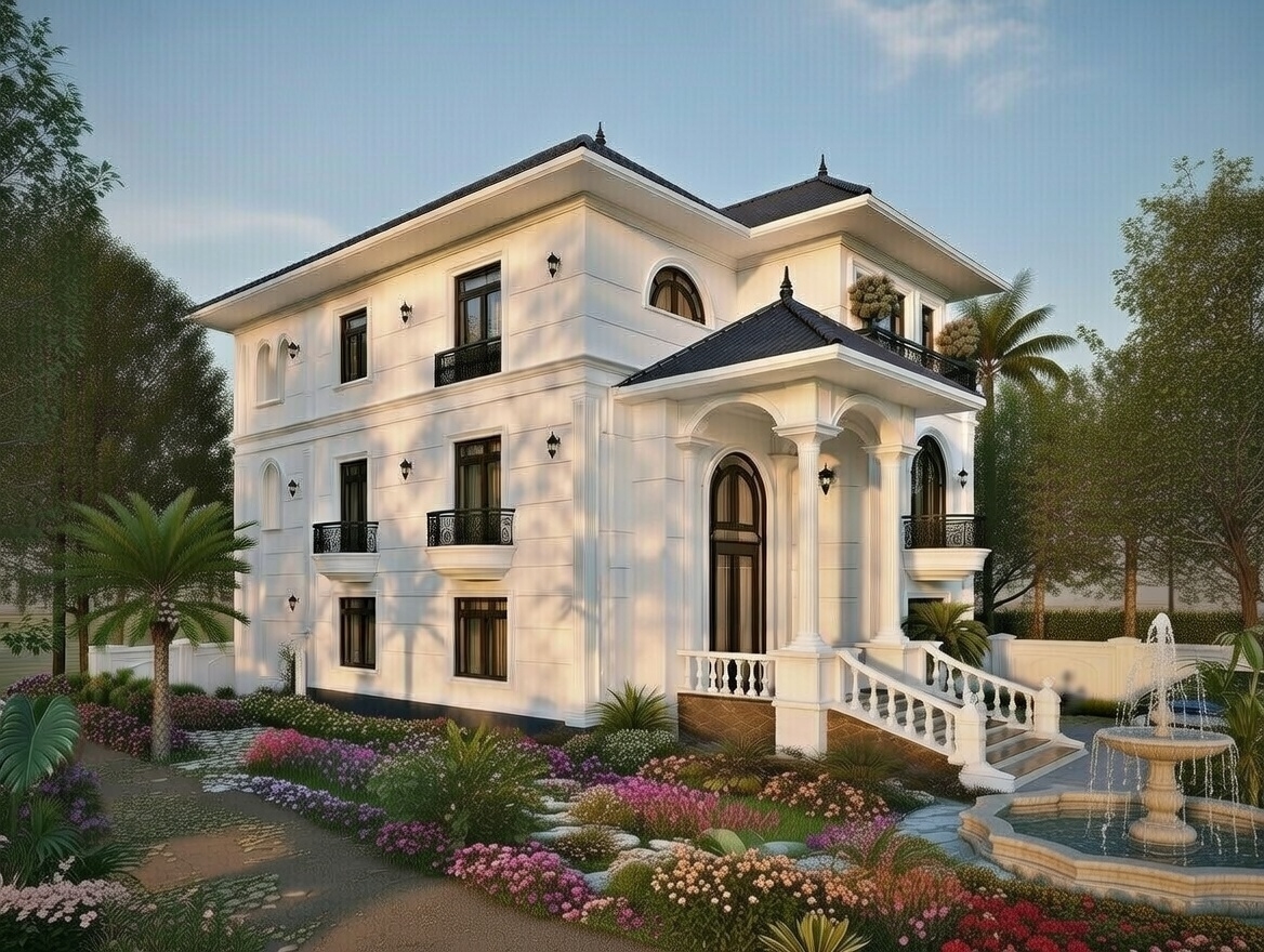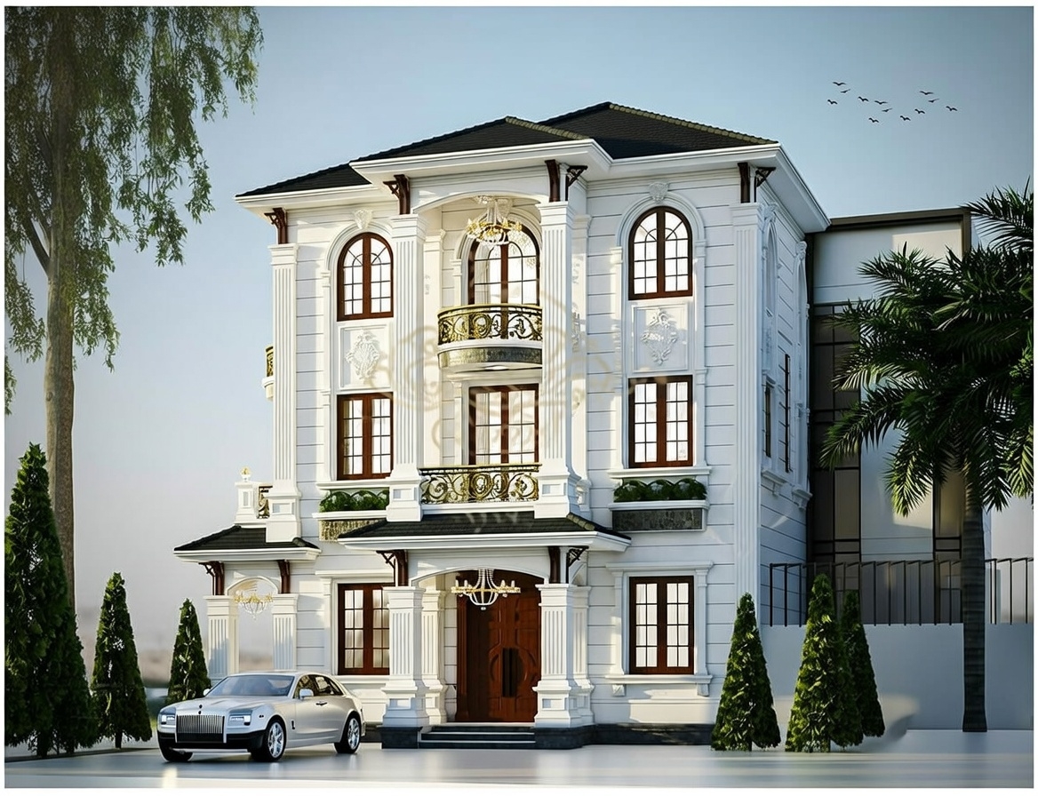 Mẫu biệt thự 3 tầng mái nhật tân cổ điển là sự giao thoa độc đáo giữa đường phào chỉ tinh xảo của kiến trúc Châu Âu và hệ mái nhật phẳng phiu, tạo nên một vẻ đẹp sang trọng, đẳng cấp nhưng không quá nặng nề. Phong cách này thường chú trọng vào các thức cột đồ sộ tại sảnh chính và màu sơn trắng sứ đặc trưng, tôn vinh vị thế của chủ nhân sở hữu.