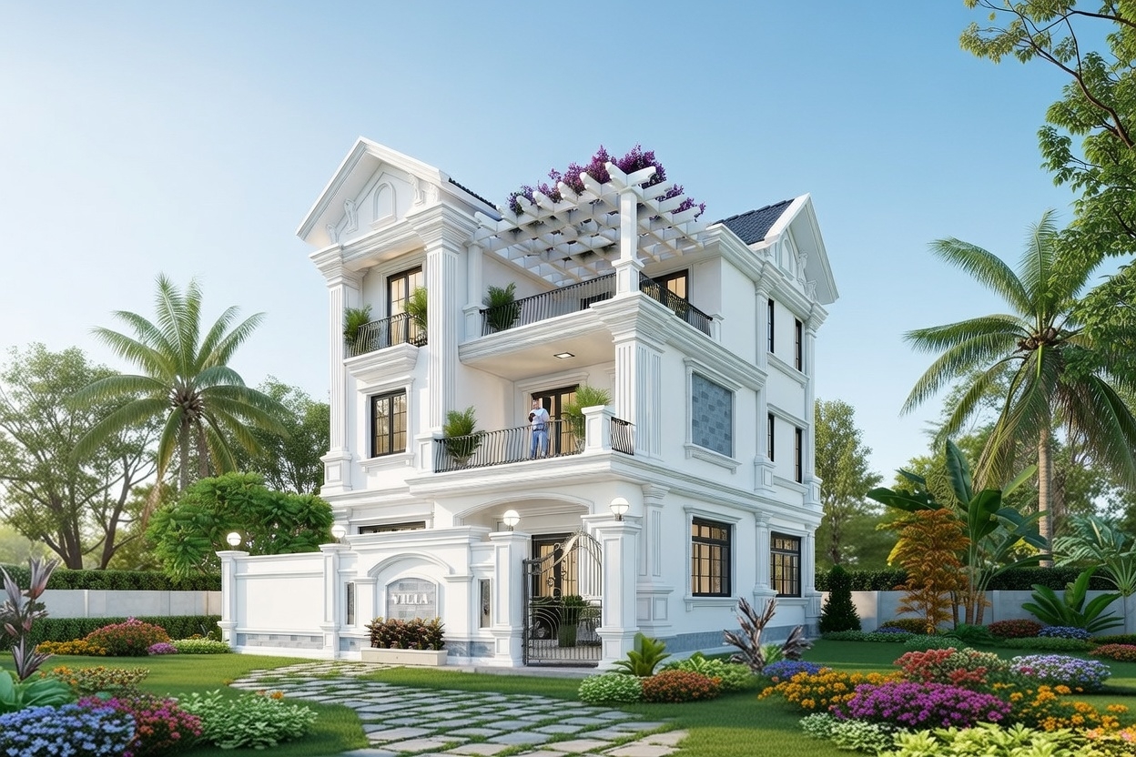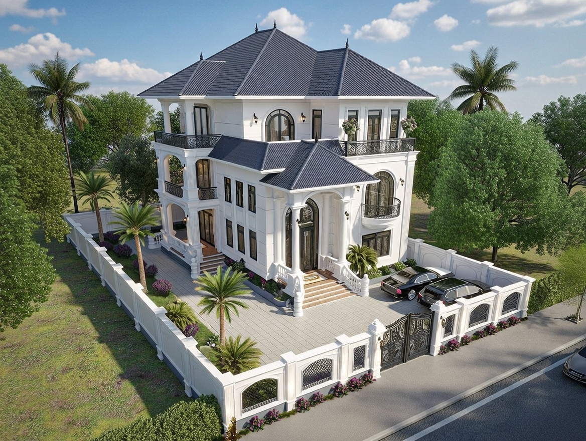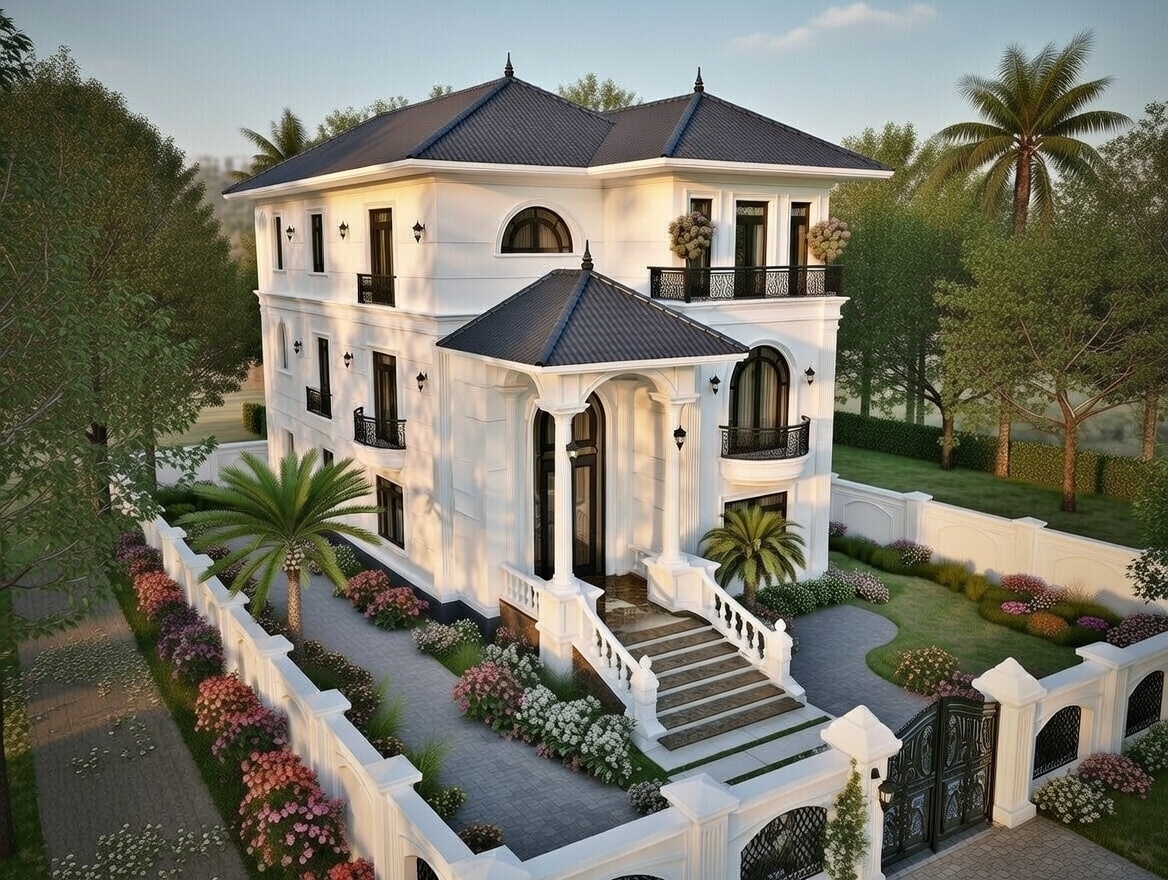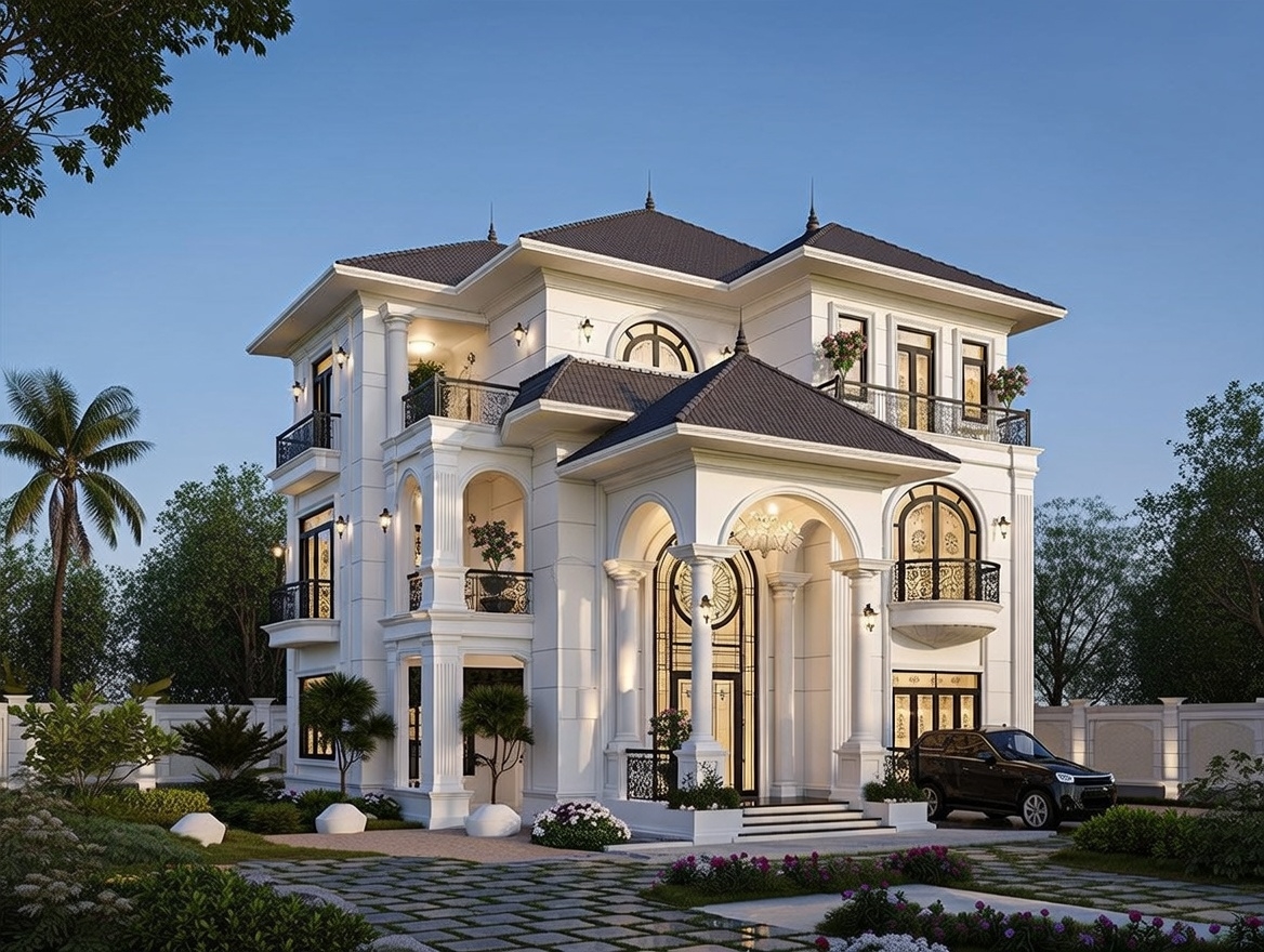 Biệt thự tân cổ điển 3 tầng mái thái là sự hòa quyện giữa vẻ đẹp sang trọng của các thức cột I-o-nic tinh xảo với hệ mái thái lợp ngói màu xanh ghi hoặc đen huyền bí, tạo nên một tổng thể uy nghi như một dinh thự Châu Âu. Phong cách này thường chú trọng vào tỷ lệ vàng trong kiến trúc, với các chi tiết ban công sắt nghệ thuật và đèn chùm cao cấp trang trí mặt tiền.