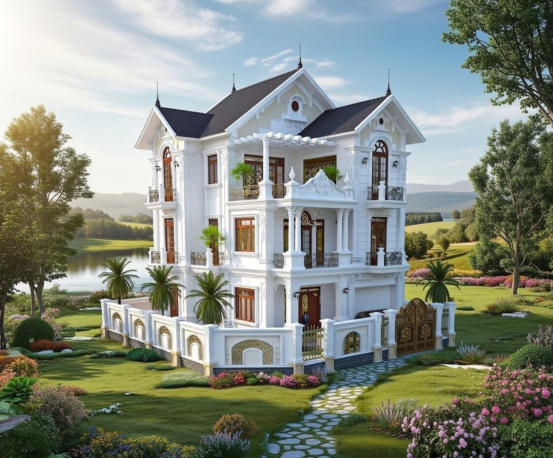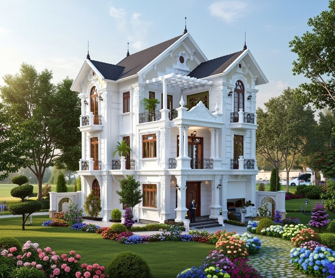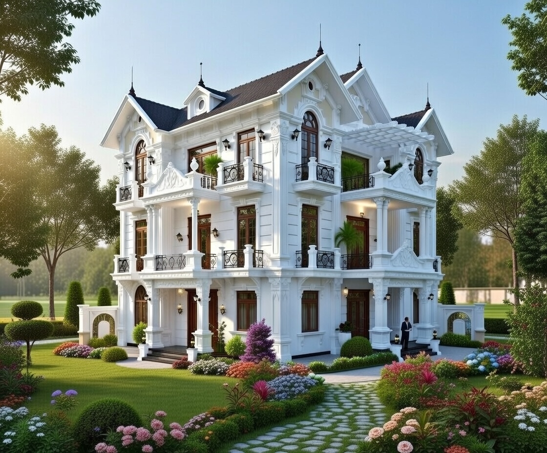 Biệt thự tân cổ điển 3 tầng mái thái là sự hòa quyện giữa vẻ đẹp sang trọng của các thức cột I-o-nic tinh xảo với hệ mái thái lợp ngói màu xanh ghi hoặc đen huyền bí, tạo nên một tổng thể uy nghi như một dinh thự Châu Âu. Phong cách này thường chú trọng vào tỷ lệ vàng trong kiến trúc, với các chi tiết ban công sắt nghệ thuật và đèn chùm cao cấp trang trí mặt tiền.