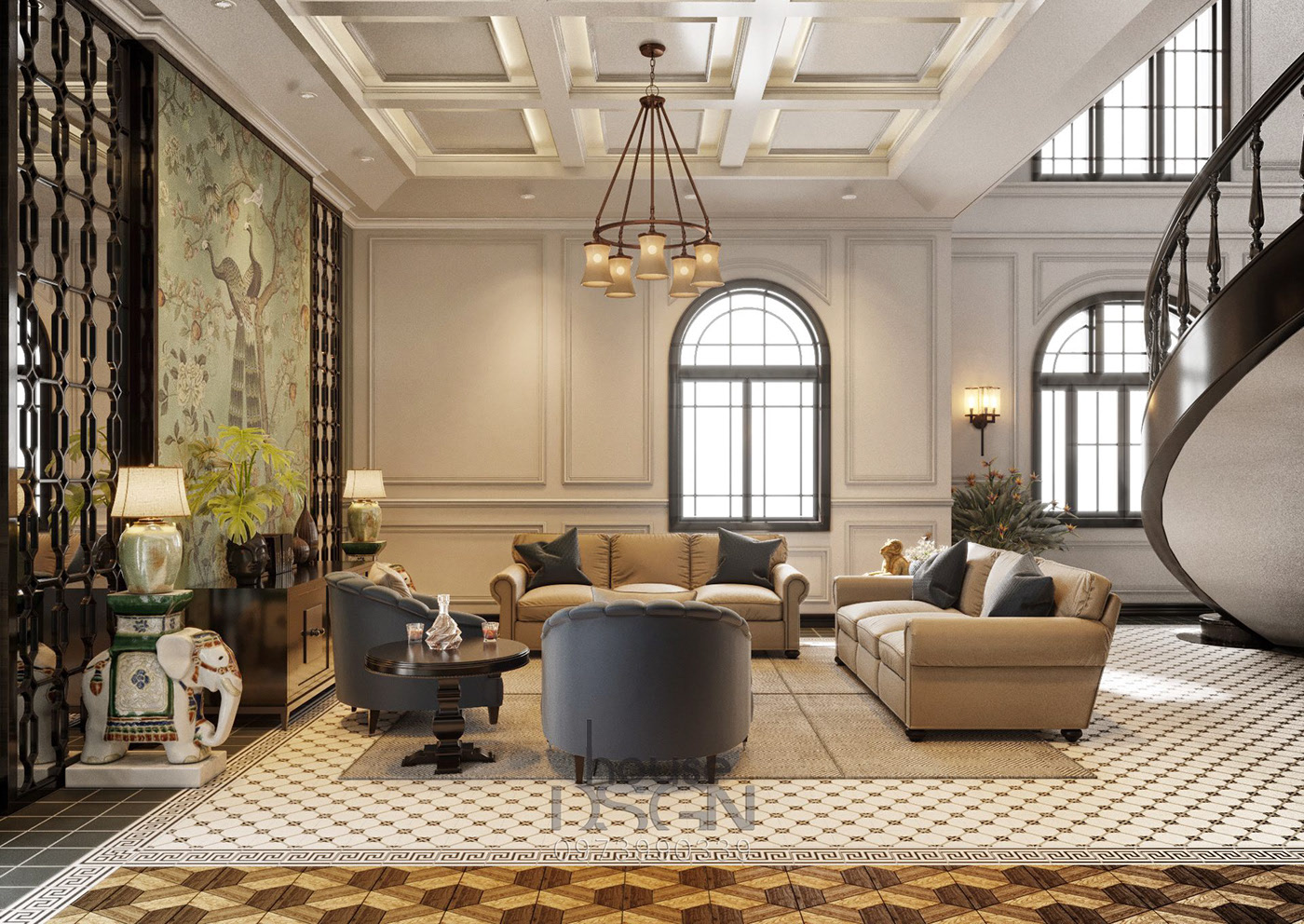 Điểm nhấn của không gian này thường là bộ sofa kích thước lớn, bàn trà mặt đá nghệ thuật và hệ thống đèn trang trí thả trần độc đáo. Đối với các căn biệt thự khu đô thị có khoảng thông tầng, việc sử dụng rèm cửa tự động kích thước lớn và vách ốp đá cao kịch trần sẽ tạo nên sự bề thế, uy nghi. Màu sắc thường được lựa chọn là các gam màu trung tính nhã nhặn, tạo cảm giác ấm cúng và hiếu khách.