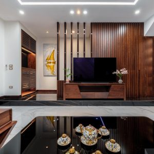 - Đặc điểm nổi bật: Tập trung vào các vật liệu thượng hạng như đá tự nhiên nguyên khối, kim loại mạ vàng PVD, da thật và gỗ óc chó. Hệ thống chiếu sáng được đầu tư kỹ lưỡng với các loại đèn chùm, đèn thả độc đáo.