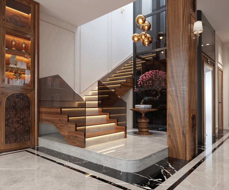 Bên cạnh đó, việc sử dụng vách ngăn kính, cửa kính lớn và đặc biệt là thiết kế một giếng trời thông tầng hiệu quả sẽ giúp giải quyết triệt để vấn đề này, đảm bảo mọi khu vực trong nhà đều nhận được ánh sáng và sự thông thoáng cần thiết.