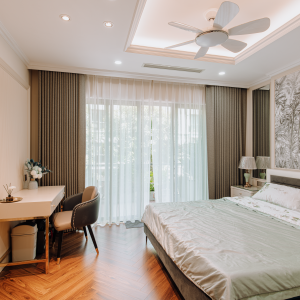 Tủ quần áo cánh kính không chỉ giúp gia chủ dễ dàng lựa chọn trang phục mà còn là một yếu tố trang trí đắt giá. Bàn trang điểm và khu vực thay đồ được bố trí khoa học, đảm bảo sự tiện nghi tối đa trong sinh hoạt hàng ngày.