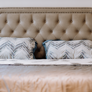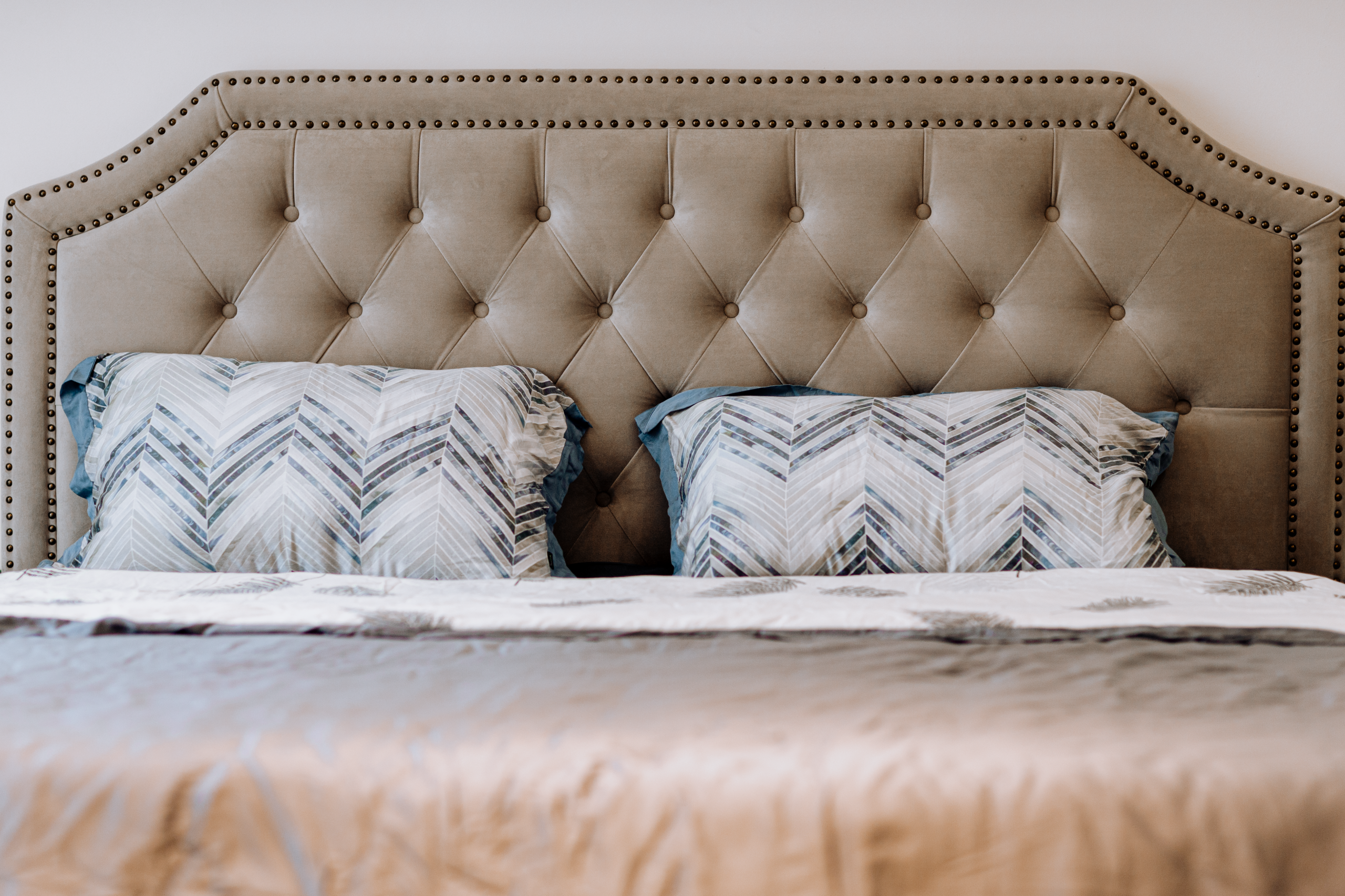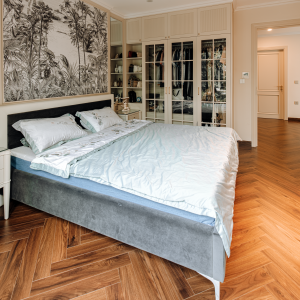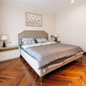 Gam màu trung tính như xám, be được sử dụng làm chủ đạo, điểm xuyết bằng các chi tiết kim loại mạ vàng sang trọng. Giường ngủ bọc nỉ êm ái, kết hợp với thảm trải sàn và hệ thống đèn chiếu sáng dịu nhẹ, tất cả tạo nên một không gian đậm chất nghỉ dưỡng tại gia.