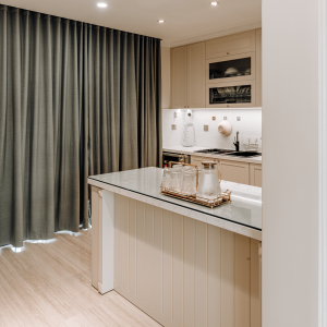 Khu vực bếp được trang bị hệ tủ bếp thông minh, sử dụng vật liệu acrylic bóng gương dễ dàng vệ sinh. Đảo bếp đa năng vừa là nơi chuẩn bị đồ ăn, vừa là quầy bar mini tiện lợi, là nơi lý tưởng cho những bữa ăn nhanh hoặc những cuộc trò chuyện thân mật.