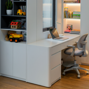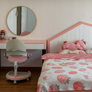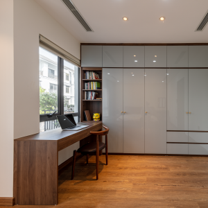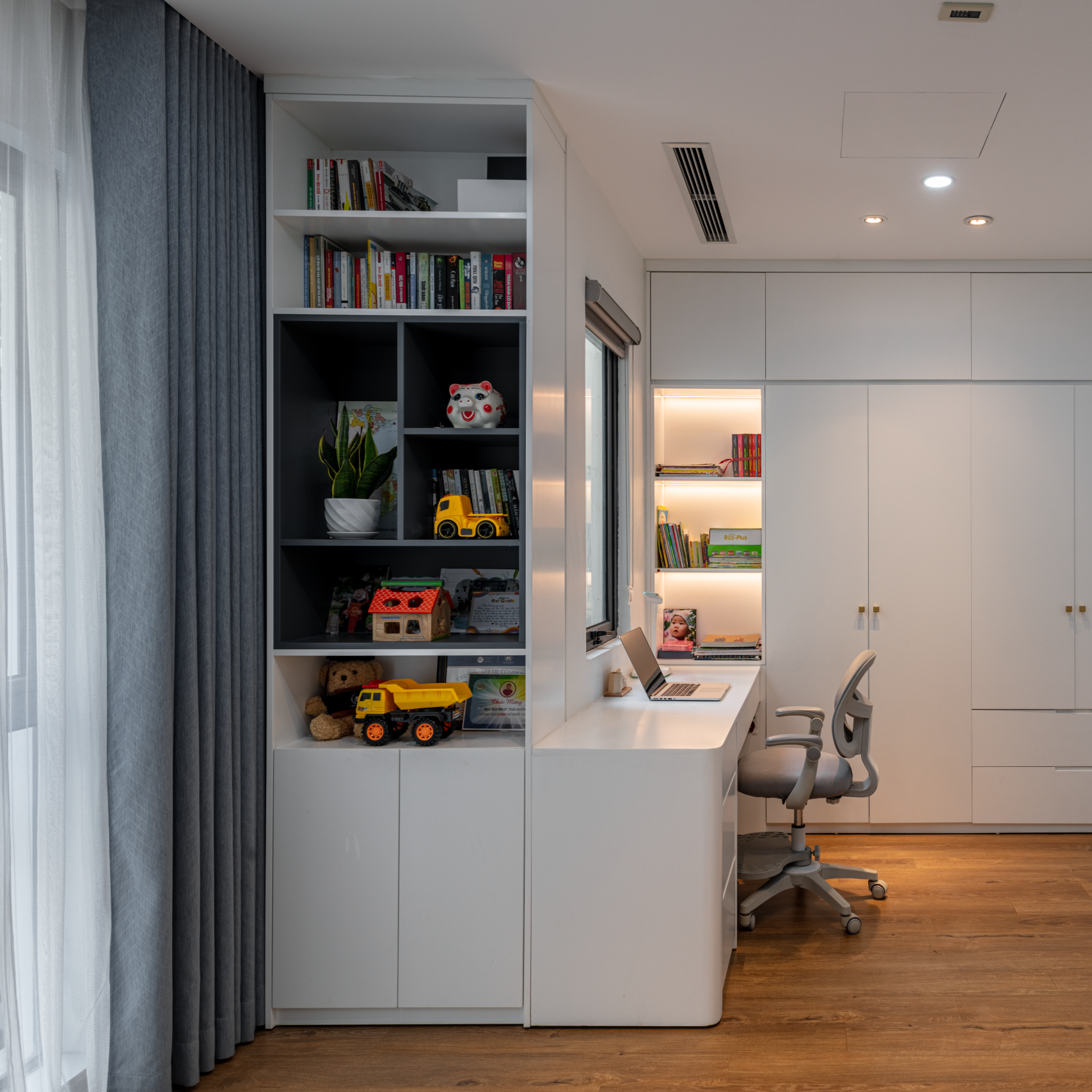 Hệ tủ quần áo lớn và bàn làm việc nhỏ được bố trí gọn gàng, đảm bảo đầy đủ công năng mà không làm không gian bị rối mắt. Ánh sáng tự nhiên được tận dụng tối đa qua khung cửa sổ lớn, giúp căn phòng luôn sáng sủa và tràn đầy sức sống.