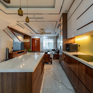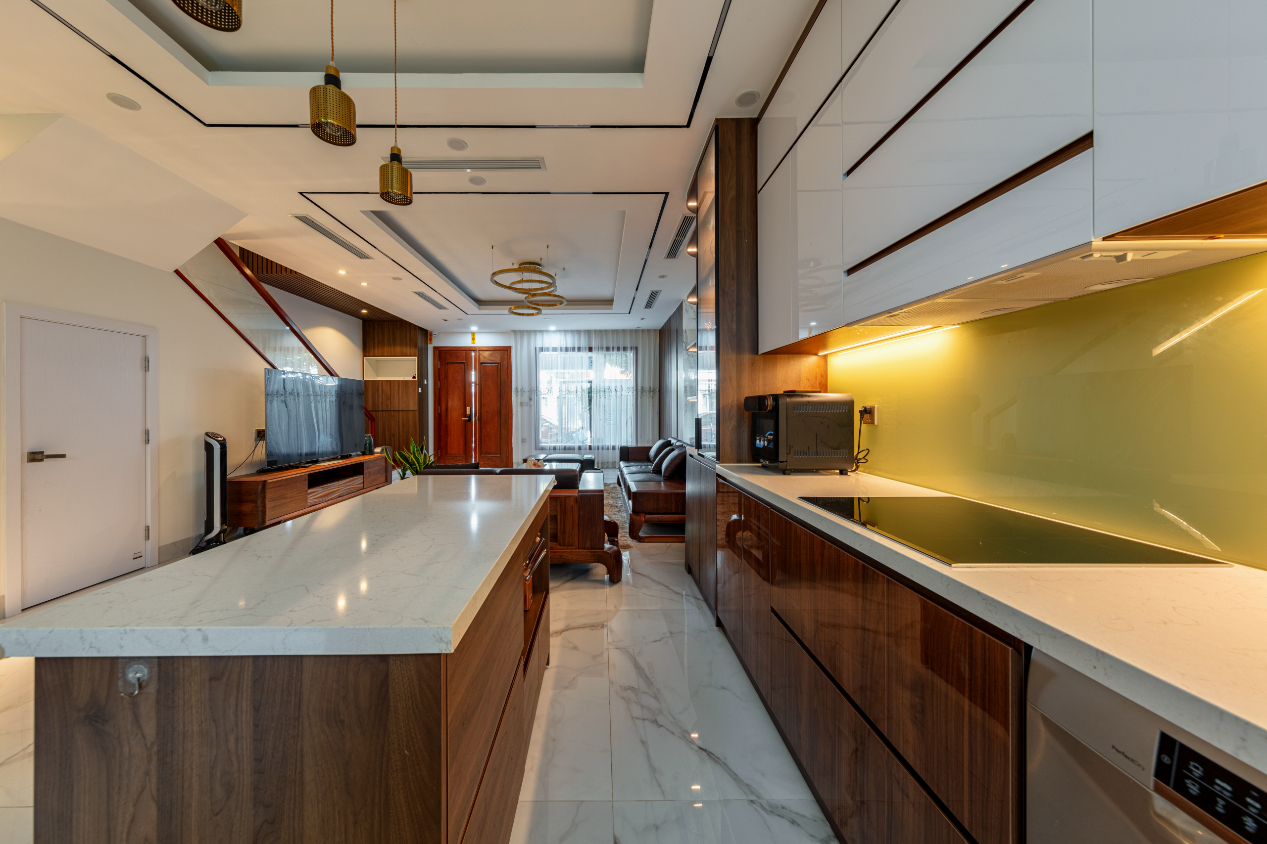Liên thông với phòng khách là khu vực bếp và phòng ăn hiện đại. Hệ tủ bếp trên sử dụng cánh acrylic trắng bóng tương phản với hệ tủ dưới và đảo bếp ốp gỗ, tạo nên sự cân bằng thị giác hoàn hảo. Mặt bếp và đảo bếp ốp đá cẩm thạch trắng vân mây không chỉ đẹp mà còn dễ dàng vệ sinh.
