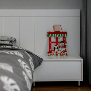 Phòng ngủ Master là một không gian nghỉ ngơi yên tĩnh với gam màu trung tính làm chủ đạo. Sàn gỗ ấm áp kết hợp với tường màu xám nhạt và trắng, tạo cảm giác thư thái, dễ chịu. Giường ngủ được thiết kế đơn giản nhưng tinh tế, tối ưu cho việc nghỉ ngơi và tái tạo năng lượng.