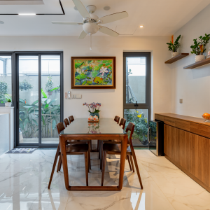 Trọng tâm của thiết kế lần này là tạo ra sự kết nối liền mạch giữa các không gian chung như phòng khách, phòng bếp và khu vực ăn uống. Việc ưu tiên sử dụng nội thất gỗ tự nhiên cao cấp không chỉ khẳng định gu thẩm mỹ của gia chủ mà còn mang lại cảm giác bình yên, thư thái cho cả gia đình sau một ngày dài làm việc.